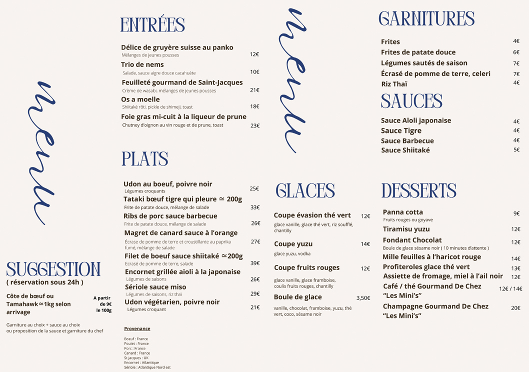 Nous avons le privilège de vous convier à savourer une expérience gastronomique singulière, où la cuisine française se fusionne délicatement avec les influences culinaires du Japon et de l’Asie du Sud-Est. Cette proposition culinaire d’exception vous est présentée au sein d’une atmosphère à la fois élégante et chaleureuse, alliant avec subtilité le raffinement à la convivialité.